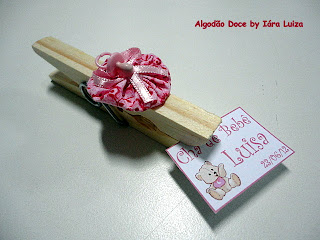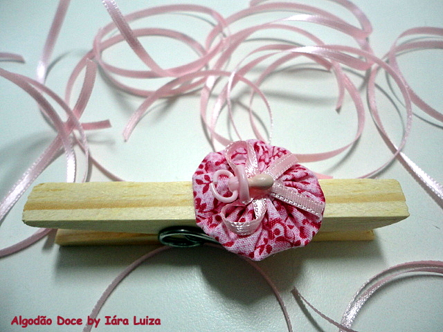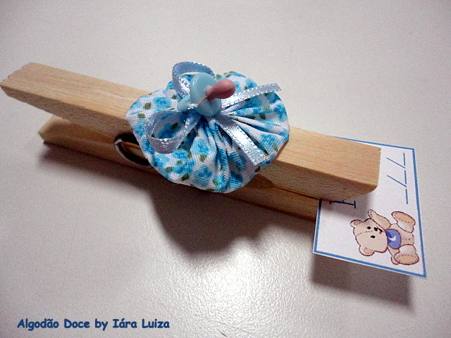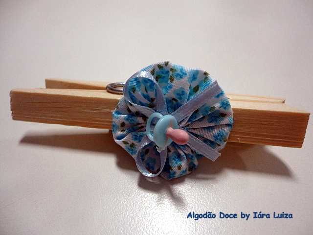 Pregadores de madeira enfeitados com fuxicos e miniaturas plásticas (chupetinhas) viram delicados