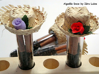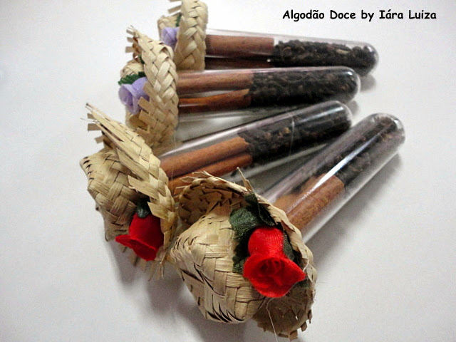 São tubetes plásticos, recheados de cravo e canela e enfeitados com mini chapéus de palha. Para essa comemoração eles foram embalados em saquinhos de celofane e acompanhados por 2 sachês de chá.